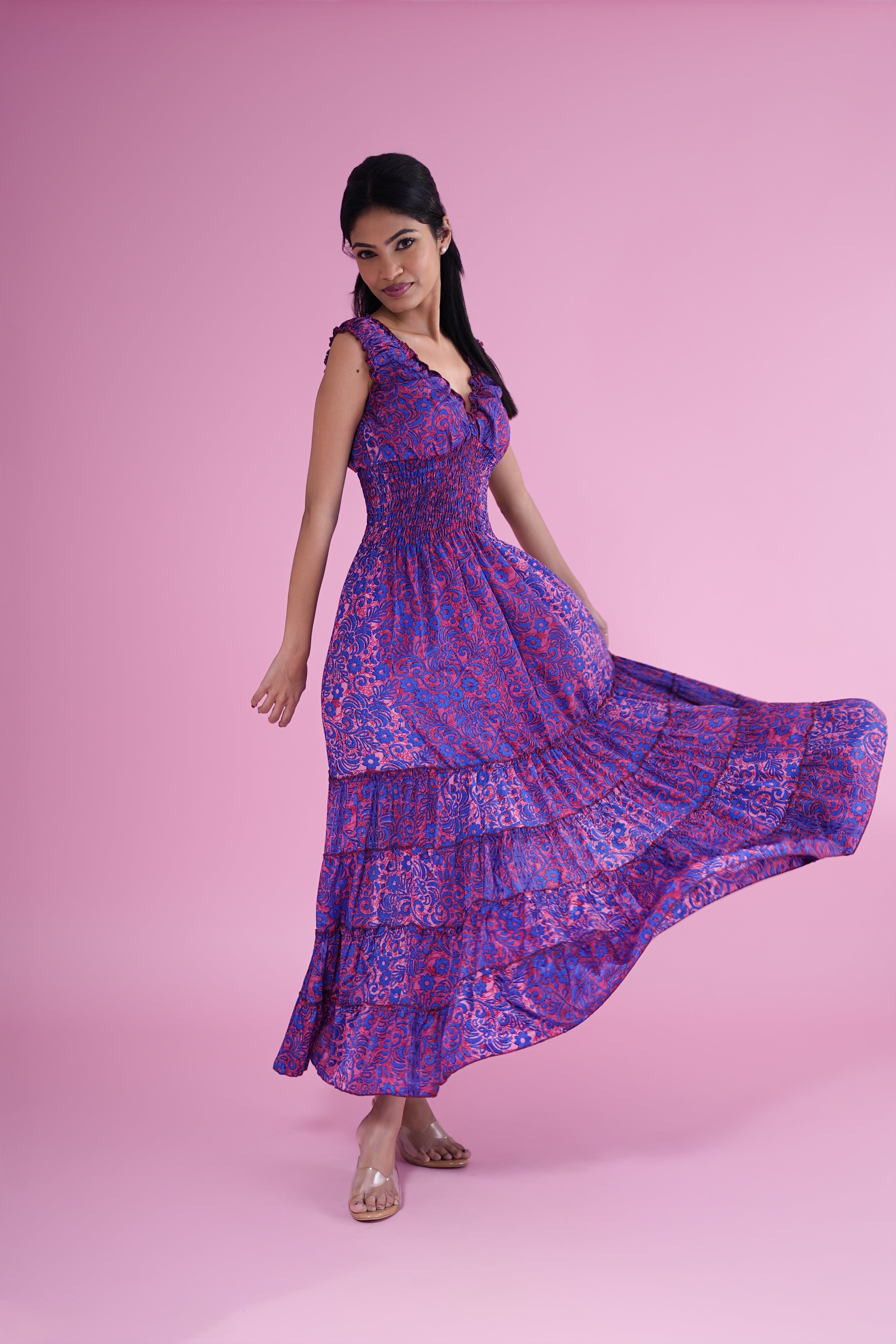 Purple & Pink Boho Printed Smocked Maxi Dress