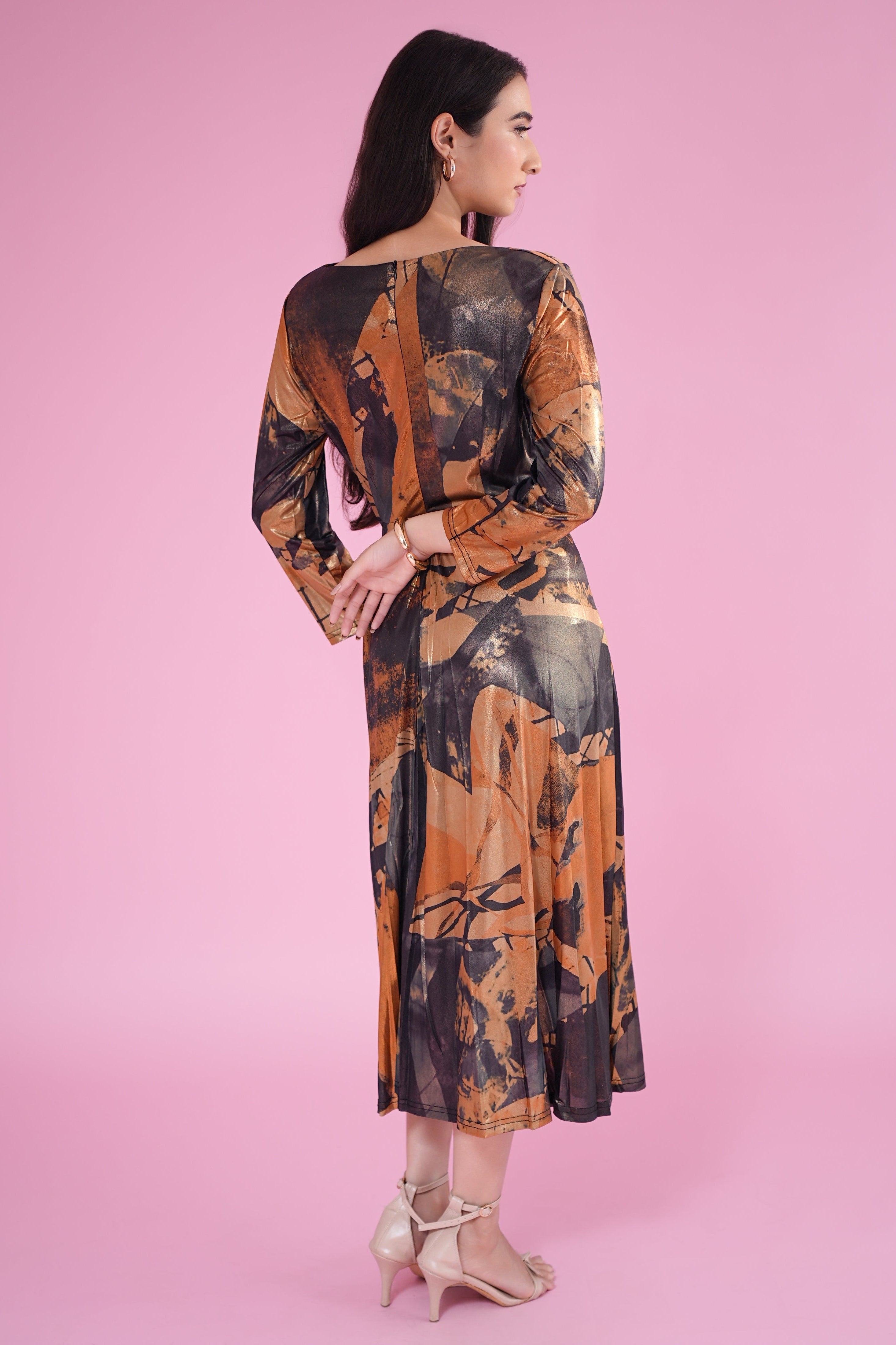 Step into timeless elegance with our Bronze Black Abstract Premium Flare Maxi Dress, crafted for women who love bold, rich and high-fashion looks. Inspired by luxury designerwear, this dress features a deep bronze and black abstract metallic print that shines beautifully under any light, giving you a premium, statement-making presence.